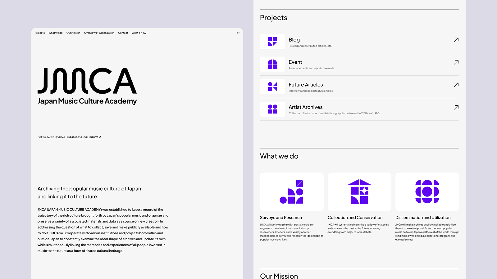 私たちは、JMCAのロゴデザインと名刺、Webサイトを制作しました。ロゴは音の波形をモチーフに音楽の広がりを表現しています。Webサイトは落ち着いたトーンと整理されたレイアウトにより、情報の信頼性と読みやすさを両立させました。